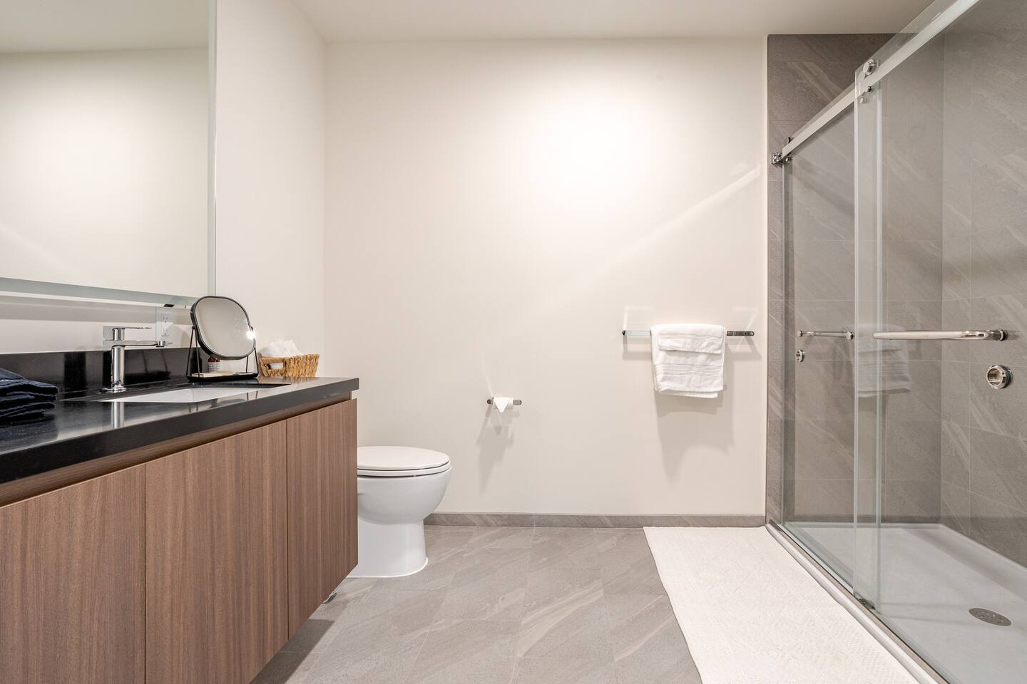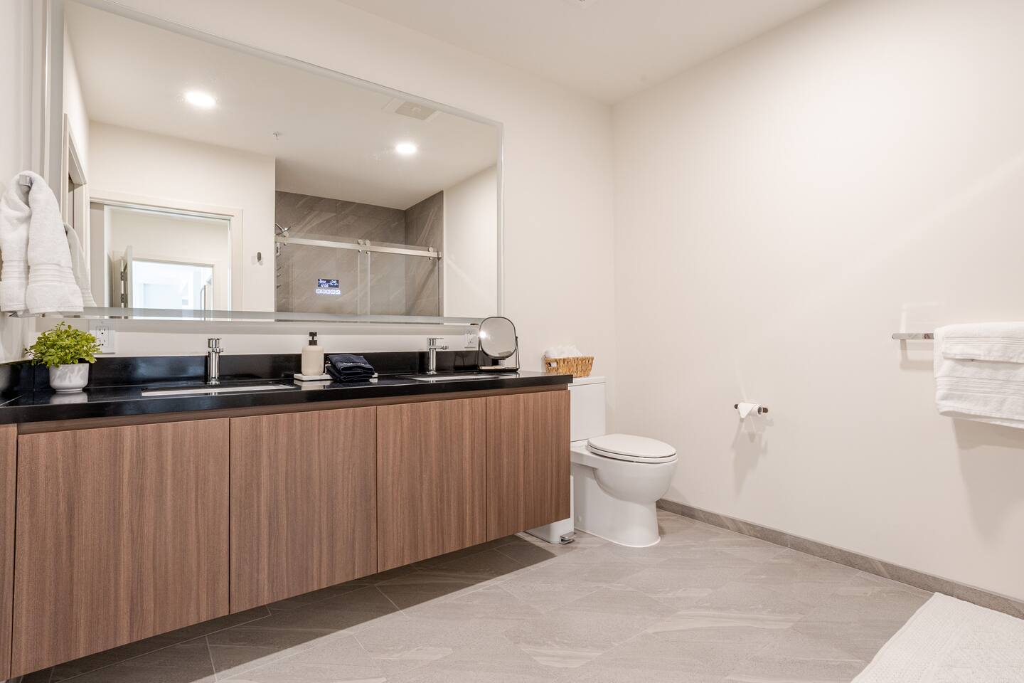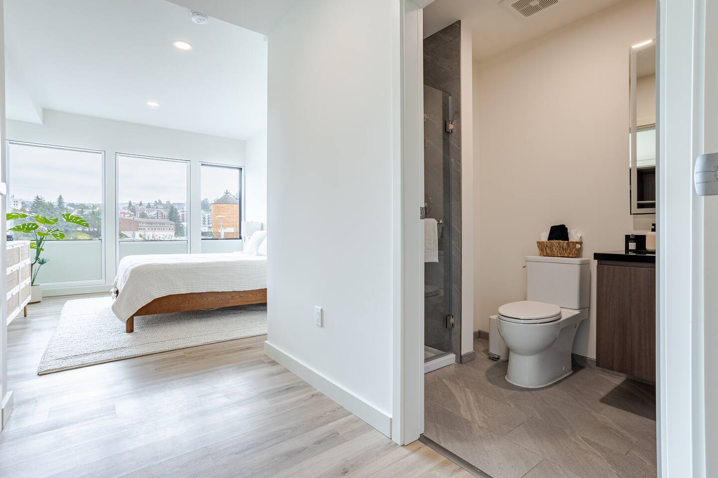 Experience comfort, convenience, and thoughtful design in this spacious third-floor condo with elevator access — the perfect base for exploring Bellingham and beyond. • 1,500 sq. ft. condo on the 3rd floor, with elevator access • Two bedrooms: one with a king bed, one with a queen bed • Two full bathrooms with walk-in showers, plus a half bath • Accommodates up to four guests comfortably • City skyline views, peekaboo water views, and sightline to Western Washington University • Private covered balcony for relaxing outdoors • Fast 1 GB Wi-Fi with Wi-Fi 6 for remote work or streaming • Three Smart TVs — in the living room and both bedrooms • Fully equipped kitchen with stainless steel appliances and cookware • In-unit washer and dryer for convenience • Central air conditioning and heating • One reserved parking space in a secure underground garage • Located steps from downtown Bellingham’s restaurants, shops, breweries, farmers market, and waterfront trails • Just 90 minutes from Mt. Baker Ski Area — perfect for skiing, snowboarding, or summer alpine hikes Please note: The nearby railway line has frequent commercial and passenger trains. Horns can be loud and occur at all hours. We provide earplugs and white noise machines in each bedroom to ensure your comfort.